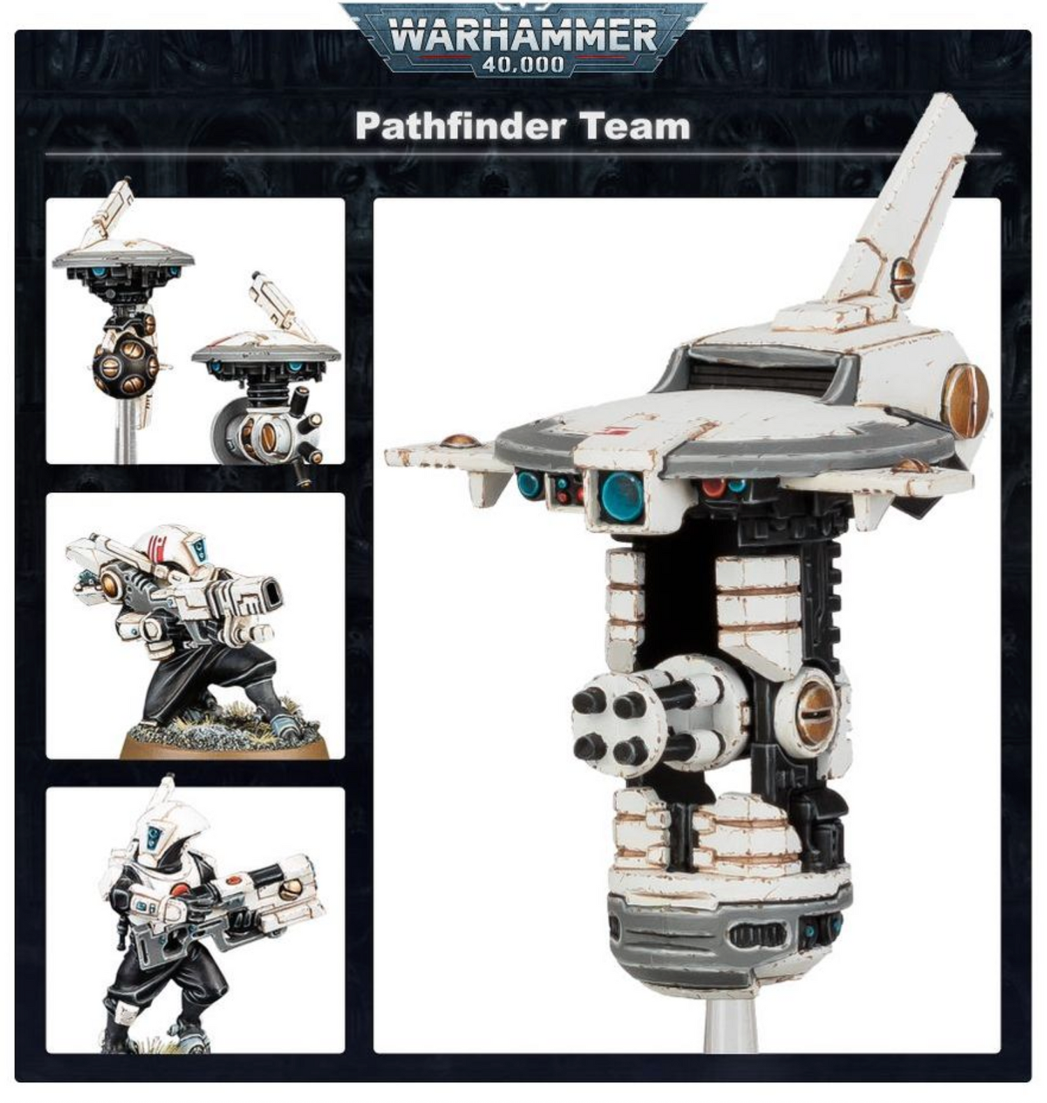 This multi-part plastic kit contains 137 components with which to make 10 T'au Pathfinders, a Pulse Accelerator Drone, a Grav-inhibitor Drone and a Recon Drone.